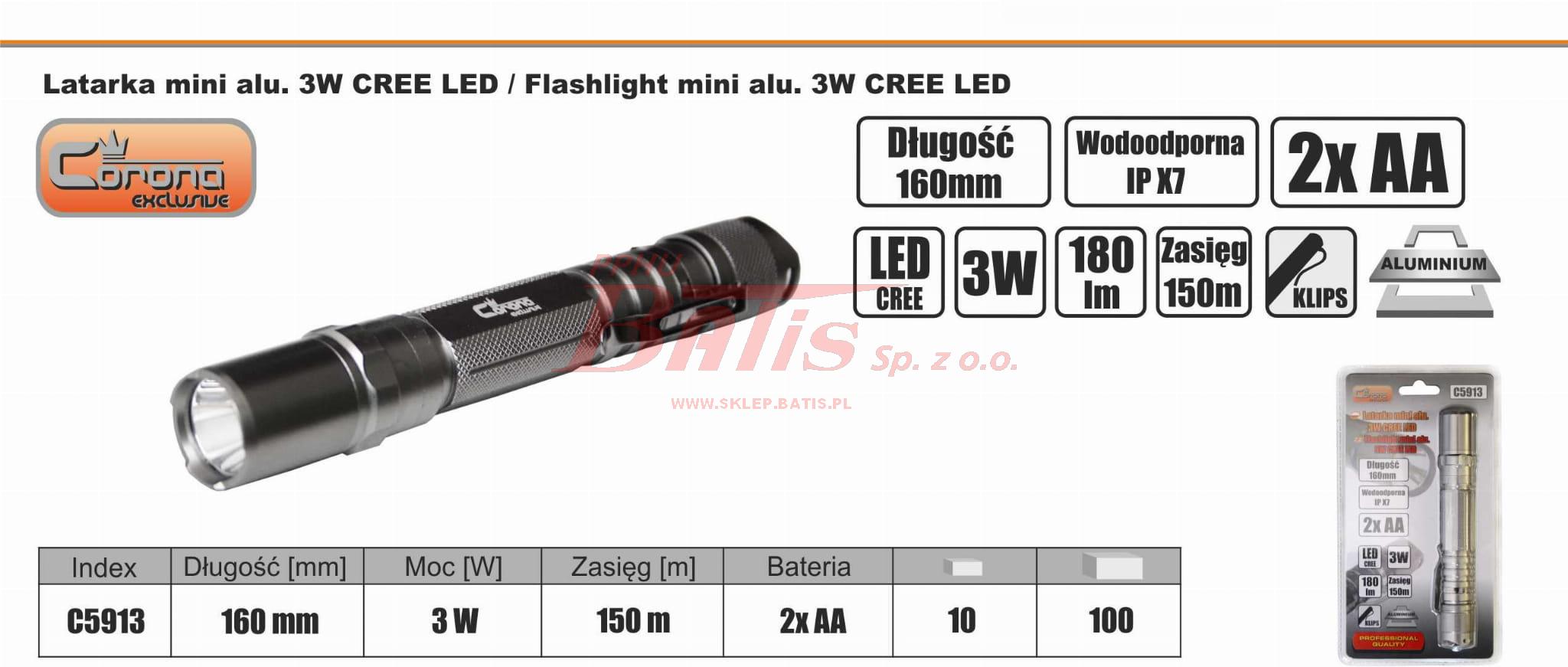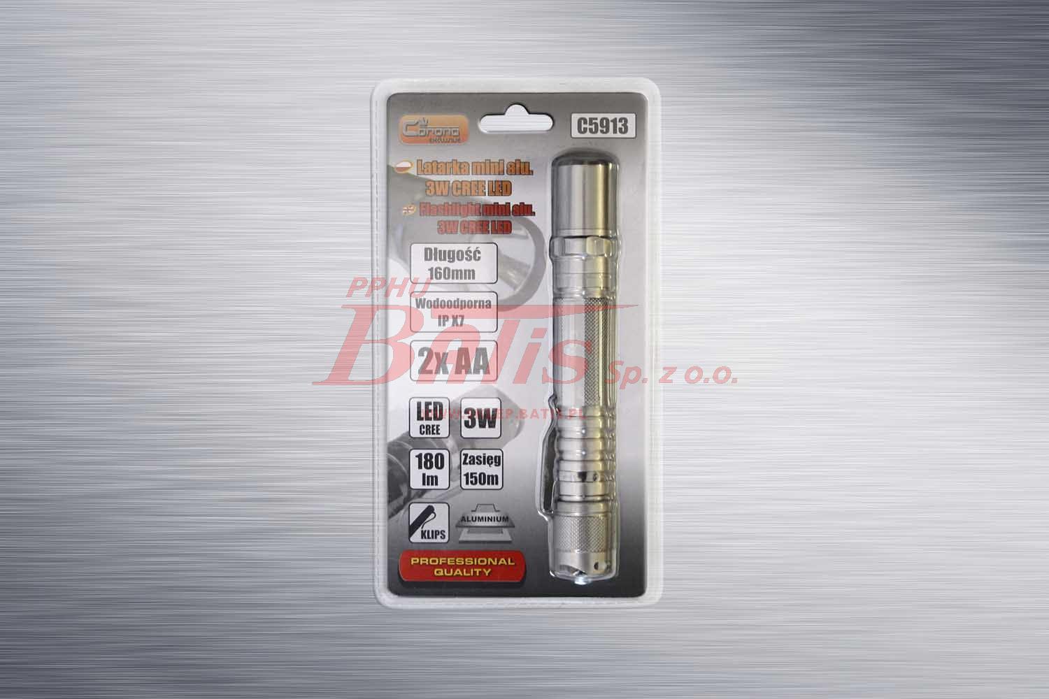 LATARKA richmann 3W CREE LED / mini, aluminiowa / 180lm; zasięg 150m / wodoodporna IP X7 / 2x AA / z klipsem /